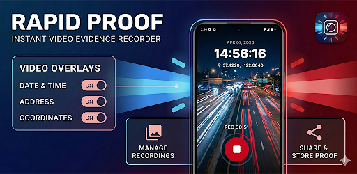 Rapid Proof is designed for emergencies. With a single tap, you can instantly start recording video evidence that includes your location, coordinates, date, and time. Perfect for capturing proof in urgent situations, Rapid Proof ensures you never miss critical moments. Choose recording durations of 1, 2, or 5 minutes, and enable auto-start to begin recording immediately when the app launches. Fast, secure, and reliable - your trusted emergency recorder.